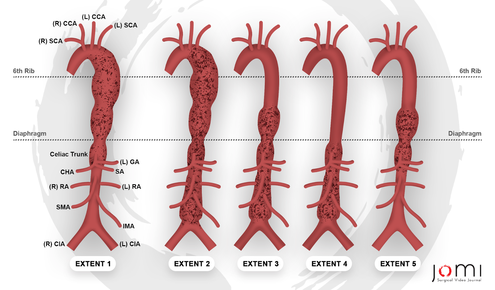 Aort anevrizmaları, aort kapağının hemen üzerinden, pelvisteki çatallanmaya kadar kökü boyunca herhangi bir noktada ortaya çıkabilen aortun fokal dilatasyonlarıdır. Sınıflandırma anatomik konuma göre yapılır ve torasik, abdominal veya torakoabdominal anevrizmalara ayrılır. Torasik anevrizmalar ayrıca kök ve çıkan aortu tutanlar, aort arkını tutanlar ve inen torasik aortu tutanlar olarak ikiye ayrılır. Torakoabdominal aort anevrizmaları (TAAA'lar) Crawford sınıflaması kullanılarak kategorize edilir: Kapsam I, sol subklavyen arterden suprarenal abdominal aorta kadar uzanan inen torasik aortun çoğunu kapsar. Kapsam II, sol subklavyen arterden aortoiliak bifurkasyona kadar aortu içeren en yaygın olanıdır. Kapsam III, distal torasik aortu içerir ve aortoiliak bifurkasyona kadar uzanır. Kapsam IV, diyaframın altındaki abdominal aort ile sınırlıdır. Safi'nin grubu, çölyak ve superior mezenterik arterlerin kökenlerini içeren, ancak renal arterleri dışlayan distal torasik aortu içeren Kapsam V'yi tanıttı (Şekil 1). 57