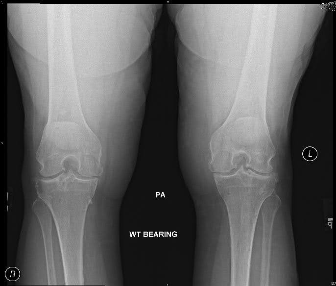 Se deben utilizar las vistas bilaterales de soporte de peso para comparar el lado afectado con el no afectado. La artrosis debe evaluarse en cada uno de los tres compartimentos de la rodilla: medial, lateral y patelofemoral. Hay que tener en cuenta que hasta el 30% de los adultos mayores de 65 años presentarán un aspecto radiográfico de la artrosis, pero un tercio de estos individuos serán asintomáticos. 3 Por lo tanto, es importante correlacionar los hallazgos clínicos y radiográficos para llegar a un diagnóstico de osteoartritis de rodilla sintomática, una entidad clínicamente relevante.