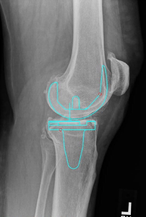 Se trata de una mujer de 66 años con dolor bilateral de rodilla, empeorado a la izquierda. Ha probado un tratamiento conservador durante varios años, que incluye la modificación de la actividad y los analgésicos orales, sin ningún efecto significativo. Los antecedentes quirúrgicos significativos incluyen dos procedimientos artroscópicos en rodillas bilaterales en los últimos siete años.