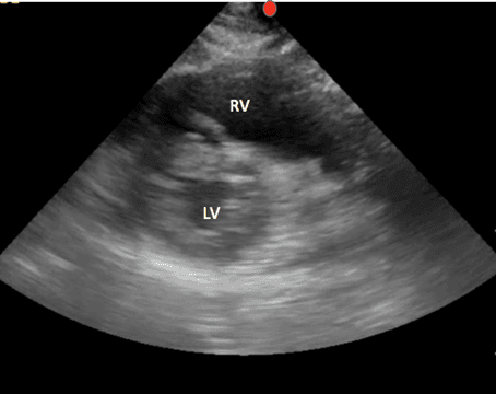 Wie beim parasternalen Long kann die parasternale Kurzansicht verwendet werden, um die globale systolische Funktion zu bewerten und Perikardergüsse zu beurteilen. Diese Ansicht ist besonders nützlich, um erhöhte Rechtsventrikeldrücke zu identifizieren, die sich als interventrikuläre Septumabflachung oder Septumbogen manifestieren (Bild 9).
