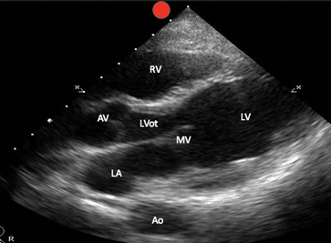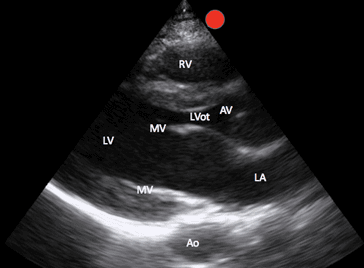 Gleiten Sie langsam einen Interkostalraum nach dem anderen nach unten, bis das PSL-Herzfenster sichtbar wird. Zu den Strukturen, die identifiziert werden können, gehören der rechte Ventrikel, der linke Ventrikel, der linke Vorhof, die Mitralklappe, die Aortenklappe, der Aortenausflusstrakt sowie die absteigende thorakale Aorta (Bild 3).