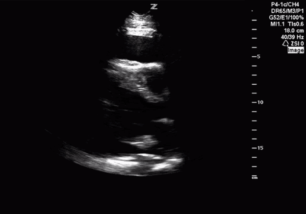 Die parasternale Langzeitansicht ermöglicht es dem Benutzer, einen Perikarderguss sowie die grobe linksventrikuläre Funktion schnell zu identifizieren und zu beurteilen. Während der Systole enthält die normale Struktur des fibrösen und serösen Perikards etwa 15-35 ml Flüssigkeit (Flüssigkeitslappen genannt) zwischen den Blättern in der unteren Herzregion. 3 Die Auswertung von Perikardergüssen erfolgt durch eine semiquantitative Messung des maximalen reflexionsarmen Raumes zwischen den serösen und fibrösen Perikardblättern während der Diastole. 3 Diese Ergüsse können in 3 Kategorien unterteilt werden: 1. Kleine <10mm 2. Mittel 10-20mm 3. Breite >20mm.3 Studien haben gezeigt, dass Notärzte einen Perikarderguss mittels Herzultraschall am Krankenbett mit einer Sensitivität von 96-100% und einer Spezifität von 98-100% nachweisen können. 2,4 Es ist wichtig, zwischen Perikardergüssen, die anterior und medial zur absteigenden Aorta verlaufen, und Pleuraergüssen, die posterior und lateral zur absteigenden Aorta verlaufen, zu unterscheiden. Perikarderergüsse können eine perikardiale Tamponadephysiologie verursachen, insbesondere wenn die Entwicklung des Ergusses akut ist. Tamponade wird am leichtesten im Ultraschall am Krankenbett nachgewiesen, indem der rechtsventrikuläre Kollaps während der Diastole beurteilt wird (Bild 4). 3