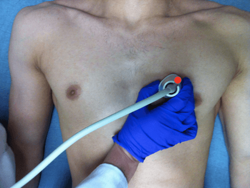 Wenn sich der Patient in Rückenlage befindet und der Sondenindikator auf die rechte Schulter des Patienten gerichtet ist, beginnen Sie mit der Sonde senkrecht zur Brustwand direkt seitlich zum Brustbein im zweiten Interkostalraum (Bild 2).