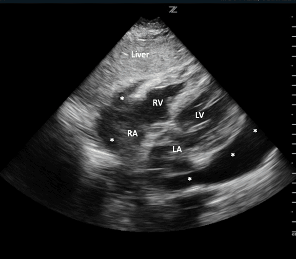 Point-of-Care-Herzultraschall ist ein wichtiges diagnostisches Werkzeug bei der Beurteilung jedes Patienten, der sich in extremis befindet. 1 Indikationen für einen Herzultraschall am Krankenbett sind Herzstillstand, ungeklärte Hypotonie, Synkope, Kurzatmigkeit, Brustschmerzen und veränderter psychischer Zustand. 2 Es gibt keine absoluten Kontraindikationen für einen eingeschränkten Herzultraschall am Krankenbett. Point-of-Care-Herzultraschall besteht hauptsächlich aus vier Ansichten, die die parasternale lange, parasternale kurze, apikale Vierkammer und die subxiphoide umfassen, aber je nach Kontext auch andere Felder wie die Lunge umfassen können.