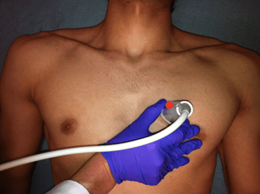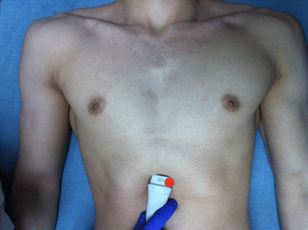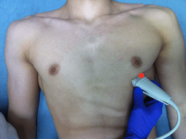 Con el paciente en posición supina y el indicador de la sonda apuntando hacia el hombro derecho del paciente, comience con la sonda perpendicular a la pared torácica justo lateral al esternón en el segundo espacio intercostal (Imagen 2).