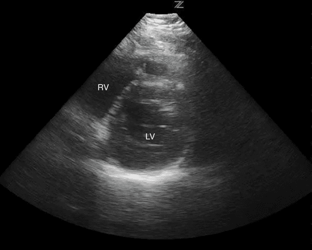 Esta vista permite la evaluación de la función del ventrículo izquierdo, la simetría de la compresión y la inclinación septal. El ventrículo izquierdo se puede identificar en esta vista y aparece como una circular en la parte inferior derecha de la pantalla. El ventrículo derecho aparece en forma de media luna y se encuentra en la parte superior derecha de la pantalla (Imagen 7).