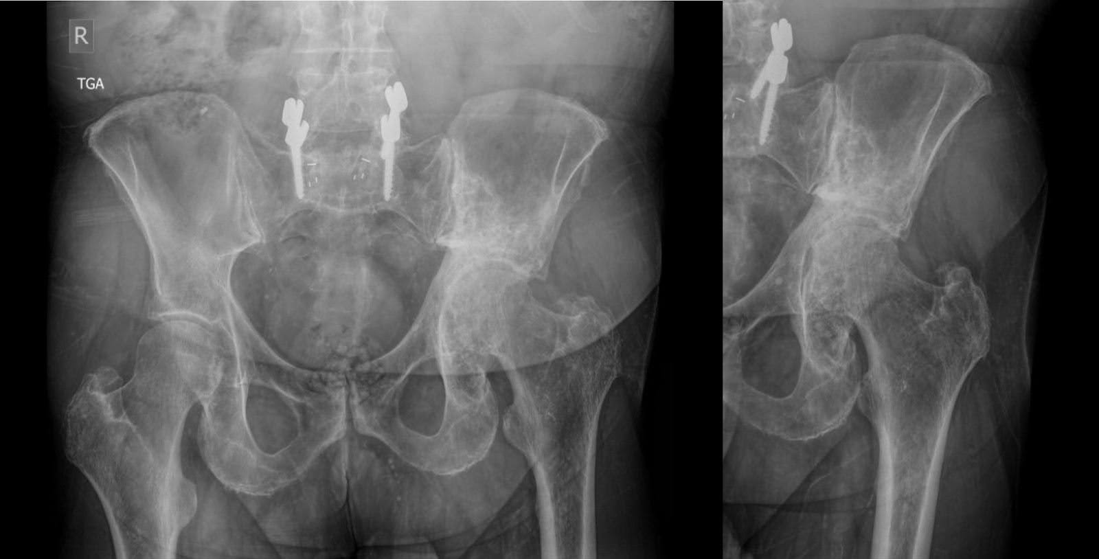 Na apresentação, a radiografia da pelve demonstrou perda de espaço articular do quadril esquerdo, osteófitos, cistos subcondrais e migração proximal do fêmur com alterações da articulação sacroilíaca. Erosão superior leve do acetábulo acompanhada de esclerose atribuída ao linfoma. Alterações degenerativas na articulação sacroilíaca e na sínfise púbica também estavam presentes. Além disso, a fixação transpedicular na junção lombossacral com marcadores de enxerto intersomático decorrentes de cirurgia de fusão lombar realizada oito anos antes para doença degenerativa do disco lombar.