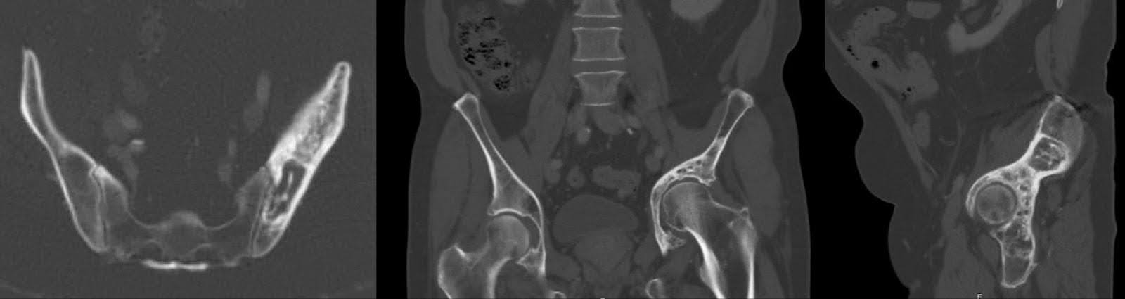 Figura 2. Incidências axial, coronal e sagital da TC da pelve três meses antes da cirurgia. Lesão mista esclerótica/lítica do acetábulo redemonstrando linfoma tratado. Colapso do teto acetabular e migração do fêmur proximal para a área supra-acetabular com protrusão.