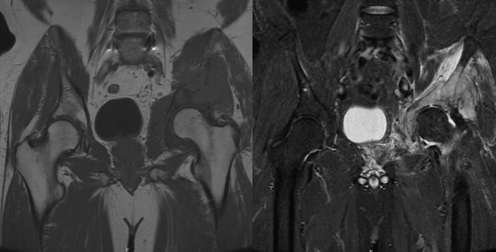 Figura 3. Ressonância magnética pré-operatória, realizada aproximadamente quatro anos antes da cirurgia de estabilização pélvica. A RM mostrou lesão hipointensa em T1 e hiperintensa em T2 no acetábulo esquerdo e osso inominado, sugestiva de processo patológico.
