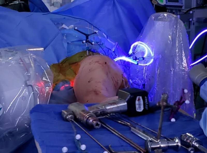 O paciente foi inicialmente posicionado em decúbito ventral, com botas de compressão aplicadas bilateralmente. Todas as proeminências ósseas foram apropriadamente acolchoadas para proteção. A fixação segura foi garantida com rolos de peito em uma mesa plana de Jackson. Antibióticos profiláticos pré-operatórios (2 g de Ancef) foram administrados, com posterior redosagem a cada quatro horas durante todo o procedimento.