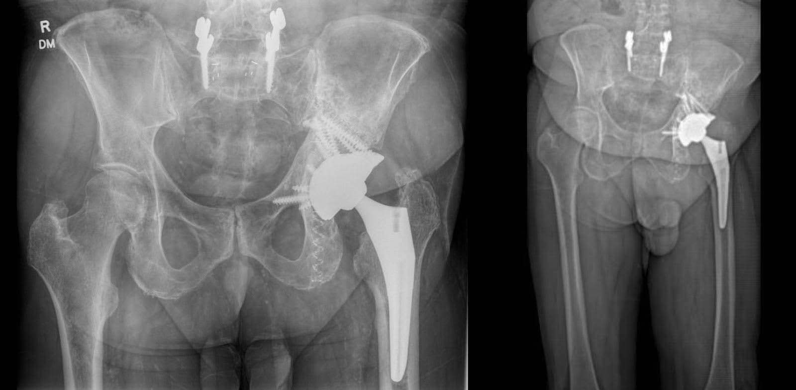 A superfície acetabular foi preparada até que o sangramento ósseo fosse alcançado. Posteriormente, o acetábulo foi preenchido com 30 cc de enxerto ósseo esponjoso cortical. Em seguida, um copo de revisão de 56 furos múltiplos foi inserido e fixado com oito parafusos de 6,5 mm com comprimento de 15 a 50 mm de diâmetro. A compatibilidade de um copo de dupla mobilidade com uma dupla mobilidade -4 e haste de 28/52 mm foi determinada como adequada para corrigir a discrepância no comprimento do membro. Os componentes finais foram inseridos suavemente sem dificuldade, com radiografias intraoperatórias confirmando o posicionamento adequado do implante. Foi realizada irrigação abundante e não foram utilizados drenos. A hemostasia satisfatória foi alcançada e o reparo dos rotadores externos e da cápsula foi realizado com túneis ósseos e pontos Ethibond #5. O fechamento do intervalo entre os rotadores externos e o glúteo mínimo foi realizado com pontos PDS #1 interrompidos. Posteriormente, o PDS # 1 foi usado para camadas fasciais profundas. A camada subcutânea profunda foi fechada com 0 pontos interrompidos PDS e a camada superficial com 2-0 pontos interrompidos PDS. O fechamento da pele foi completado com Monocryl 3-0 e Dermabond, seguido da aplicação de um curativo estéril com Telfa e Tegaderm. O paciente saiu da anestesia sem complicações, mantendo a integridade neurovascular e restaurando o comprimento do membro inferior esquerdo. O paciente apresentou contratura em flexão do quadril com necessidade de fisioterapia; no entanto, uma pequena liberação da cápsula anterior mostrou-se insuficiente dada a gravidade da contratura. A duração do caso foi de 386 minutos, com perda sanguínea estimada em 400 mL. O paciente permanece vivo 18 meses após a cirurgia, com acompanhamentos formais em duas semanas, seis semanas, três meses, quatro meses, seis meses e nove meses. No último acompanhamento, ele relatou melhora no controle da dor, recuperou a deambulação, passeou com o cachorro diariamente e completou mais de 30 sessões de fisioterapia.