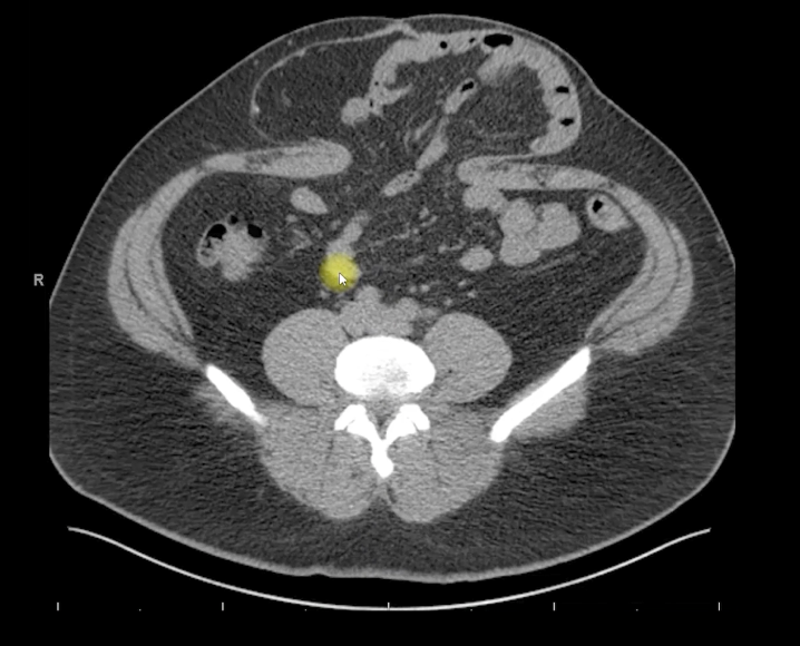 腹部のCTスキャンでは、上腹部の離位4cmとM3ゾーンに8cmのヘルニア欠損が認められました。直筋自体はどちらも約8cmの大きさでした。ヘルニアには閉塞していない小腸のループがあり、嚢への癒着の兆候がありました。